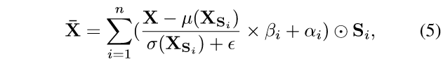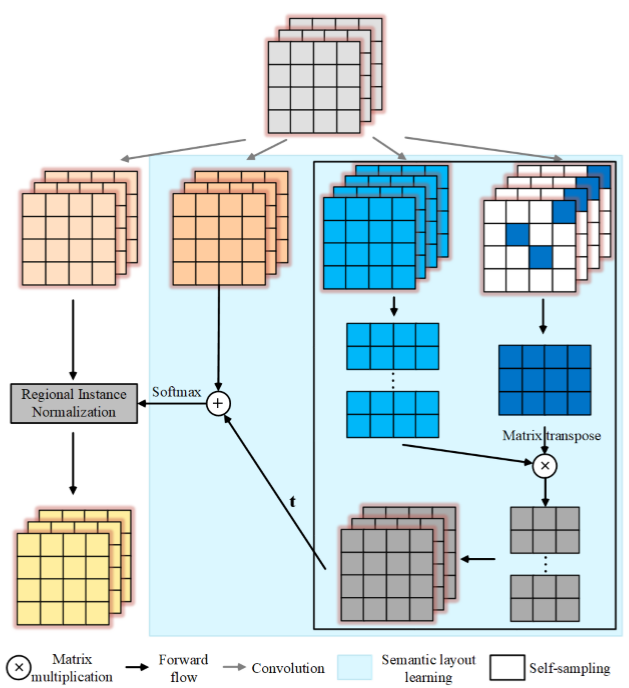 基于得到的语义布局,空间信息的传播可通过在每个语义布局区域里独立进行归一化来完成。因为这些有相似语义的特征点的分布在归一化操作后变得紧密了,所以该归一化操作自然会增强其关系,免受空间距离的限制。通过这些点独有的可学习的仿射变换,其共有特点得到了保留甚至是强化。