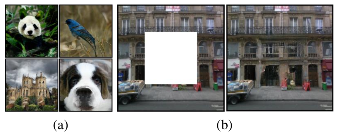 图1:GAN使用本文方法,实现条件图像生成效果图,(a)类条件图像生成,(b)图像修复