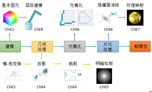 图形绘制系统的4个主要任务:模视变换、投影、明暗绘制、纹理映射、层级建模