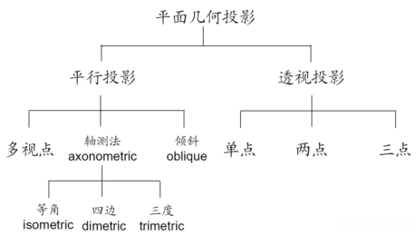 Projection矩阵(即投影)主要涉及两种类型:平行投影和平行透视。其中正交投影被视为一种主要代表。具体包括单点透视、两点透视以及三点透视(这些类型与视点数量相关)。