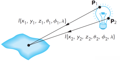 ray tracing 方法:生成图像的一种方法就是从单个点光源出发,追踪所有射出的光线,确定哪些光线最终进入了照相机的镜头.然而,在每条光线被吸收或散射或者穿过无限远的空间之前,有可能与物体发生多次相互作用.