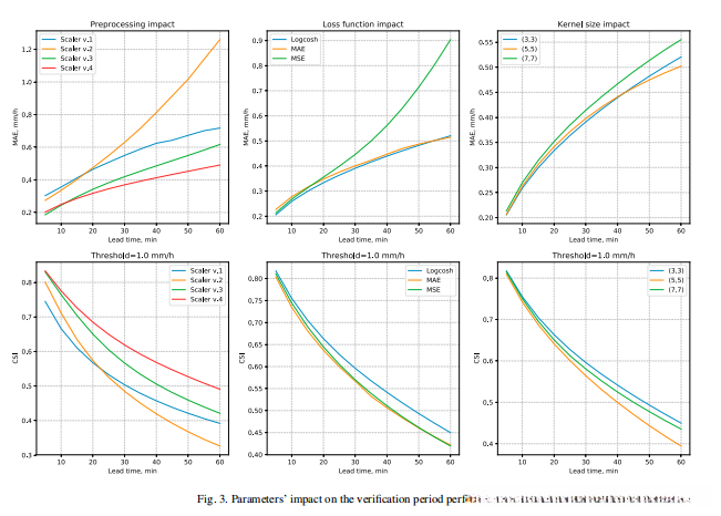 从左侧的两张图片中我们可以发现Scaler.4不论是在MAE还是CSI上效果都是要优于其他三种预处理方式。中间两幅图可以得出损失函数Logcosh效果最佳。另外,从最右侧两张图可以得到3*3的卷积核效果要优于其他两种卷积核,这是因为卷积核越大,感受野越大,越容易造成过拟合,加大预测的不确定性。