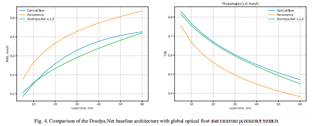 从实验结果中可以看出Dozhdya.Net在MAE这一项指标上长期的效果要优于光流法,在CSI上略微弱于光流法。因此,即使和表现最好的光流法相比,该简化模型也显示了相当的效率,可作为进一步发展的坚实基础。