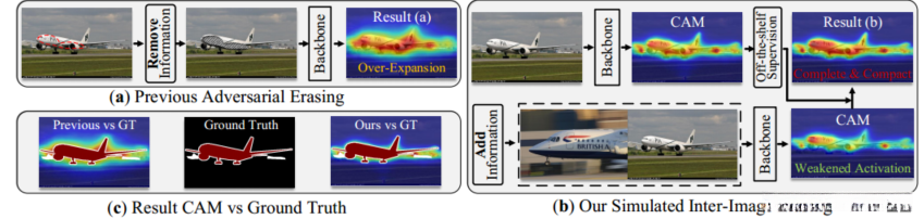 图一:(a)传统对抗性擦除方法往往面临难以控制的过度扩张问题。(b)与现有的信息去除策略不同地,在配对图像中融入额外的对象知识以减弱当前对象的激活程度。随后通过学习锚点分支的目标知识来改进随后较少激活的注意图,并通过这一改进过程来增强网络的定位能力。(C)实验结果对比分析