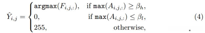其中255代表不确定区域的忽略标签;argmax函数提取出最大激活值对应的语义类别;通过应用像素自适应细化模块[47]处理伪标签