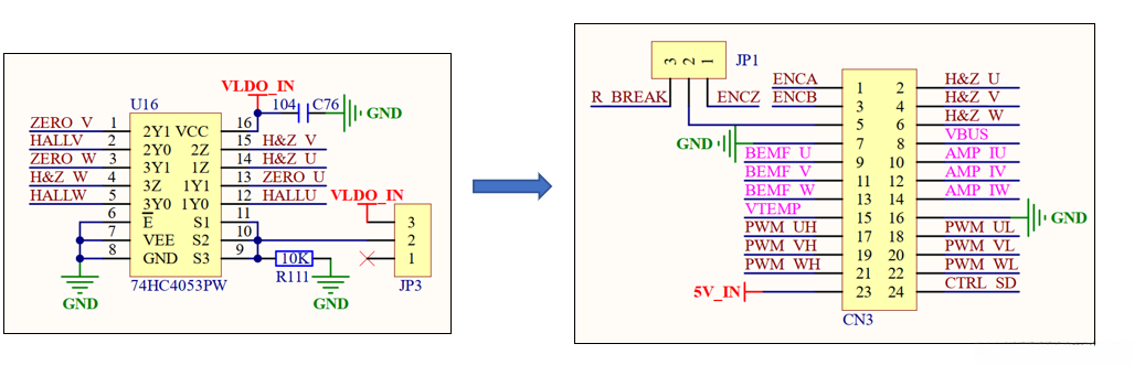 在输出三个过零信号后,到达上图左侧的复用芯片,通过右下角的跳线帽可以选择连接霍尔信号或过零信号,随后右侧端子用于连接电机开发板。类似于有感控制,仅使用H和Z引脚(V、W)进行供电,其中H或Z引脚的选取由左侧复用芯片决定。