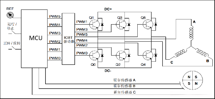 带有位置反馈的传感器系统,其数据采集依赖霍尔式位置检测传感器;无传感器系统,其数据采集依赖反电动势信号。这里仅介绍有感控制,无感控制将在后续章节详细讲解!