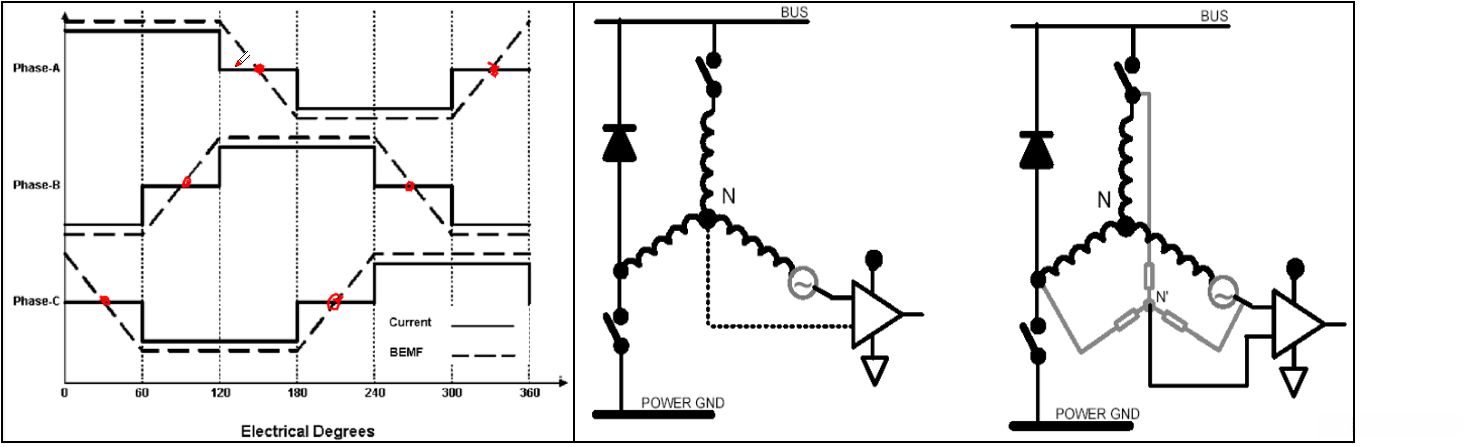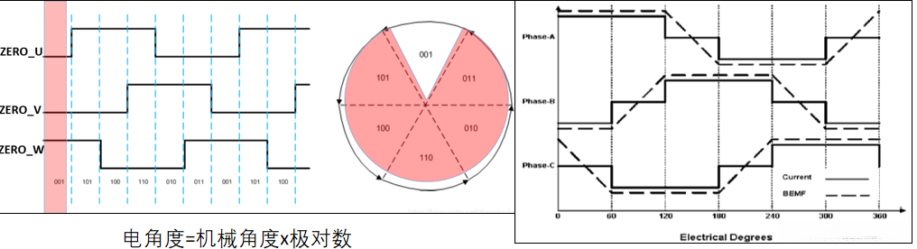 注意:1、多个过零信号的组合能够精确确定转子位置;2、过零点出现在换相操作提前30度的时刻。(参考左图理解操作流程)