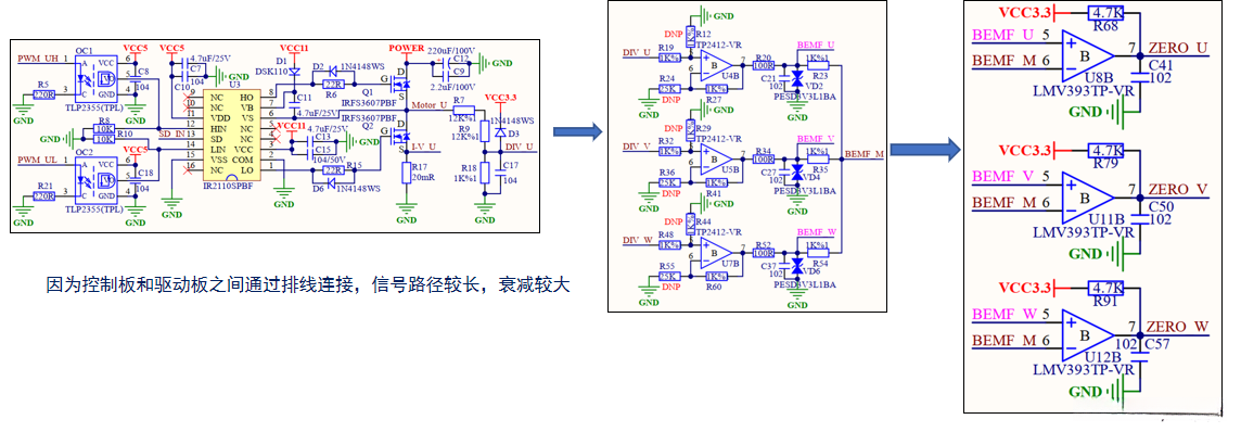 当相电压过高时,采用电阻分压网络进行分压(左图最右侧);运算放大器不仅隔离了输入和输出信号,还增强了信号的驱动能力(中);在7脚处接入了RC低通滤波电路,以有效去除信号线上的高频干扰(中);其中,BEMF_M被视为虚拟中性点,右图是该电路的核心组成部分,若BEMF_U(V或W)电压高于中性点BEMF_M,则输出1,反之输出0;通过ZERO_U(V、W)过零信号的组合,可以精确判断转子的当前位置。