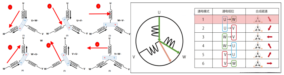内转子式BLDC经简化处理后,其工作原理如下。控制电路中,u、w、v三相电流可正可负,通过两两组合导通,形成六种不同的组合方式,也被称为六步换相控制。