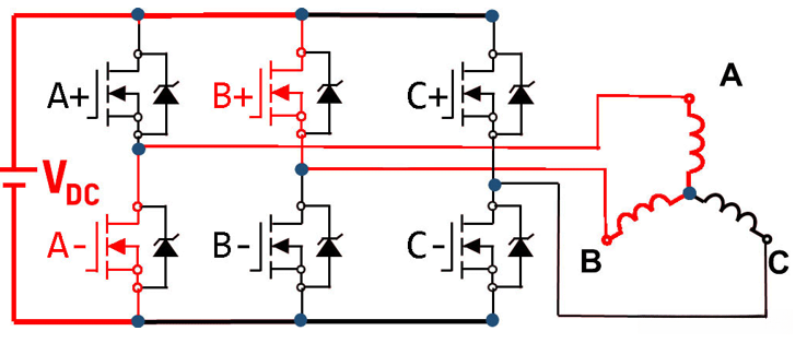 ③六步组合。上下桥臂的导通情况,共6种,也称为6步换向。