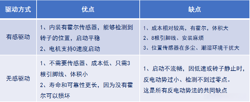 有感驱动:基于霍尔信号的组合进行判断转子当前位置;无感驱动:利用过零信号的组合进行判断转子当前位置。