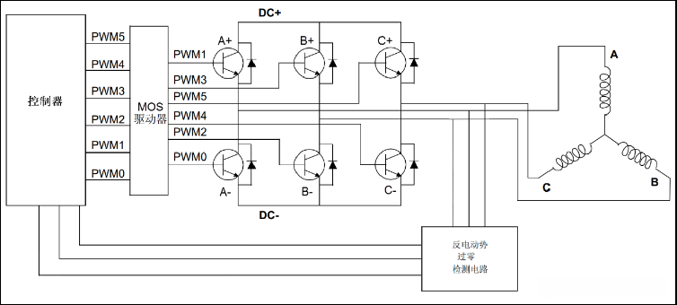 利用过零点信号的综合分析,识别转子位置信息,进而控制逆变器功率器件的开/关动作,以实现绕组的换相过程。