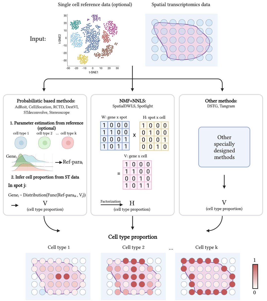 近年来,提出了多种ST去卷积方法。ST数据的现有去卷积方法大致可分为三类:概率方法、基于非负矩阵分解(NMF)和非负最小二乘(NNLS)的方法以及其他方法:1)概率方法,包括Adroit、cell2location、DestVI、RCTD、STdeconvolve和stereoscope,其中明确或参数化指定数据分布,并使用基于似然的方法进行推理。2)基于非负矩阵分解和神经网络分解的方法,包括spatialDWLS和SPOTlight。3)其他方法包括DSTG和Tangram,使用一些专门设计的方法架构或损失函数来估计细胞类型比例。