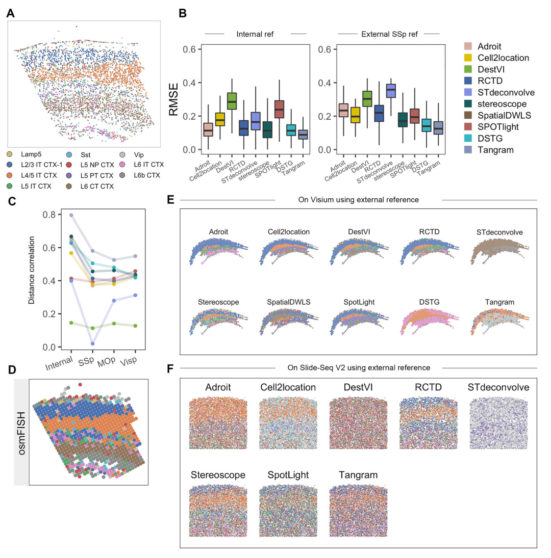 小鼠初级体感皮层区域数据:大多数方法尤其是Tangram和DSTG,在使用完全匹配的内部引用时都能获得优异的性能。通过内部参考,Adroit、cell2location、RCTD和stereoscope仍然提供了令人满意的细胞类型比例估计,尽管可用的基因数量有限。当使用外部参考时,无论基因数量和平台如何,RCTD和stereoscope都优于其他方法。当有足够数量的基因时,Cell2location在ST和Visium数据上表现相当好。
