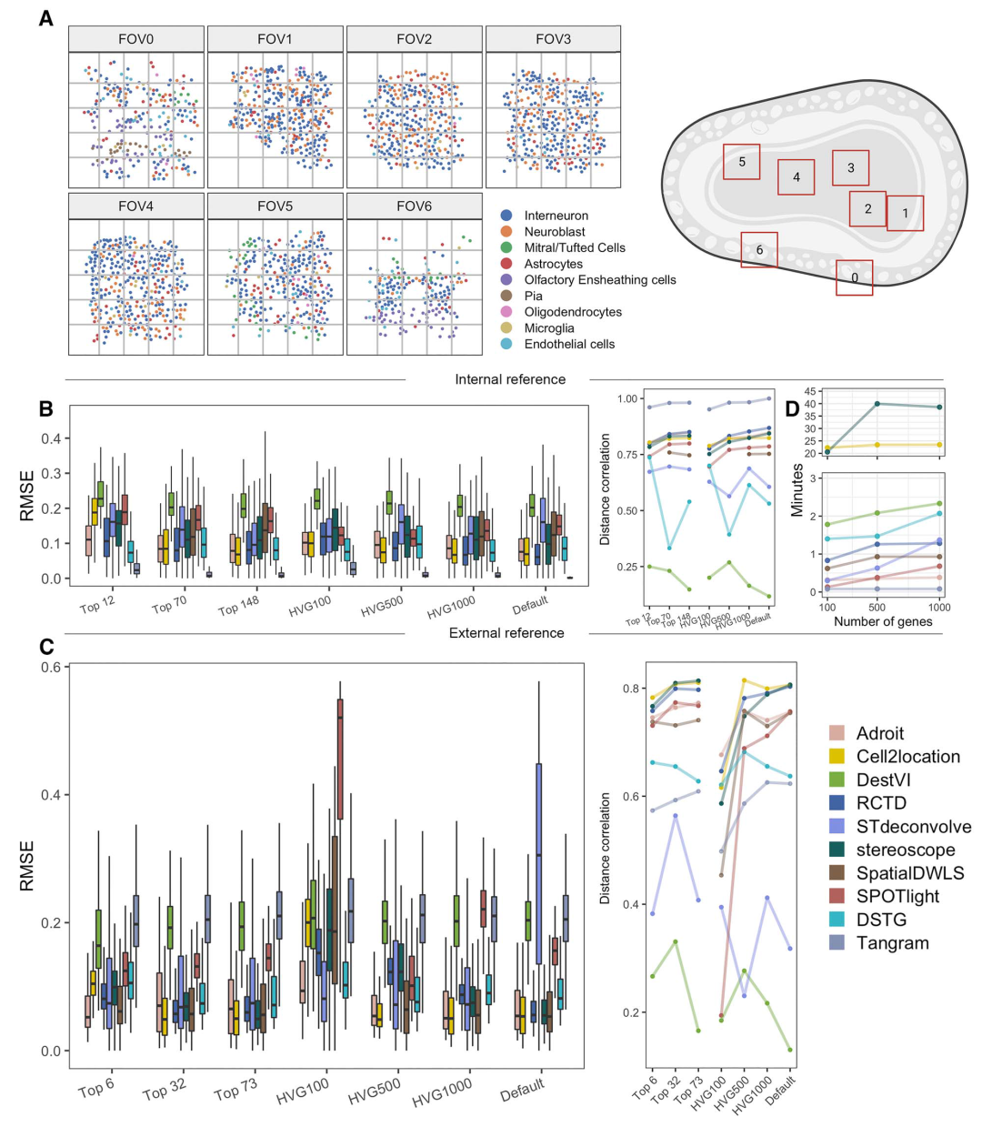 小鼠嗅球 (MOB) 数据:综合内部和外部参考所观察到的模式,结果表明RCTD、cell2location和stereoscope是对参考scRNA-seq和目标ST数据之间的批次效应最稳健的 。
