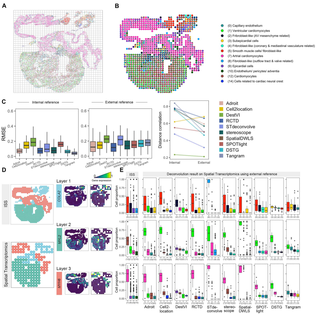 人类心脏的发育数据:当使用内部参考(即ISS单细胞)对ISS数据构建的伪点进行去卷积时,Adroit、RCTD、stereoscope、DSTG和Tangram显示出优越的性能,与在MOB数据中的观察结果相似,但这里的基因数量要少得多;当使用外部参考时,只有RCTD和stereoscope能够捕捉细胞类型的预期空间分布。总体来说,除了DestVI和Tangram未能捕捉到某些层的主要细胞类型外,其他方法的表现都比较好。其中,stereoscope、cell2location和RCTD与ISS细胞组成的一致性较高。