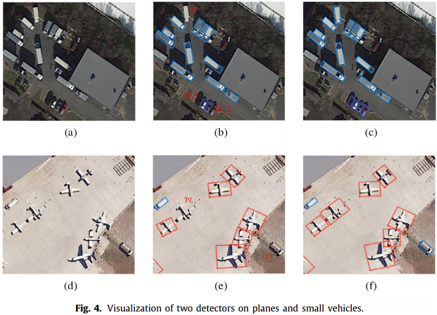 图4展示了小型车辆与飞机的对比检测试卷结果。其中图4a与d分别代表待检测试卷图像源数据集中的样本图像;而图4b与e则对应于基于S2A-NET算法进行过的检测试卷运算结果;同理可得图4c与f是基于S2ANET-SR算法处理后的检测试卷输出数据集。通过对比分析可以看出,在图4b与e中存在3个以及2个未能被S2A-NET算法成功检测试试看出的目标物体;这些未检测试试看出的目标物体均以红色字体进行了特别标注以供进一步研究分析。为了进一步提高小尺寸物体如车辆与飞机等目标项目的检测试试看效利用率,在本研究工作中特意引入了一个超分辨率模块并合理配置了一组优化损失函数参数设置以实现目标项目的精准检测试试看。”