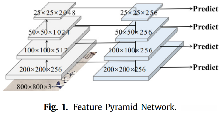 以前的检测网络主要依赖最后一层特征图进行预测,在面对图像中目标不同尺度时表现出较差稳定性。为了应对这一挑战,FPN提出了一个创新性解决方案。如图1所示左侧部分展示了输入的不同分辨率特征图分别包含256、512、1024及2048个通道信息。而经过FPN处理后输出的所有特征图统一缩减至256个通道(如图1右侧)。为此方案中采用多级特征提取策略作为最终表征手段,有效解决了多尺度检测问题并显著提升了检测性能。