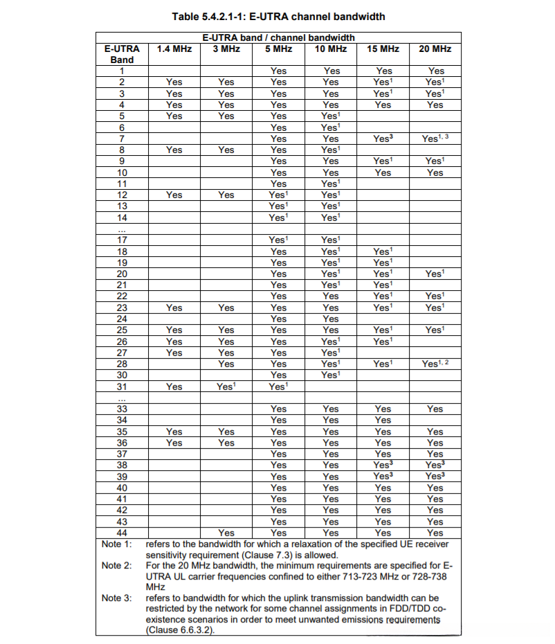 LTE支持六种信道类型(channel),具体包括1.4兆、3兆、5兆、10兆、15兆和20兆频段。每个BAND(频段)可支持其中一部分或全部六种信道带宽。详细信息请参考下表