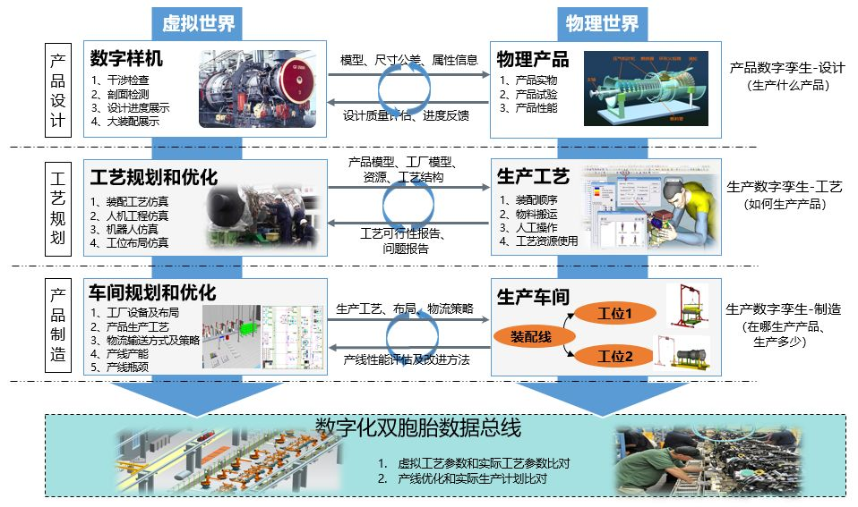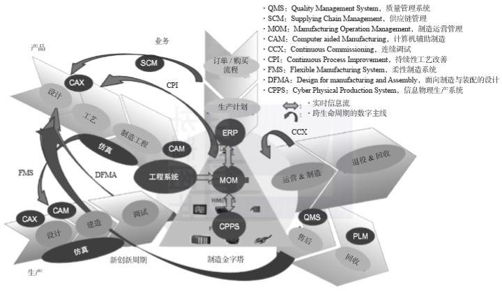 在产品的制造阶段,生产数字孪生的主要目的是确保产品可以被高效、高质量和低成本地生产,它所要设计、仿真和验证的对象主要是生产系统,包括制造工艺、制造设备、制造车间、管理控制系统等。