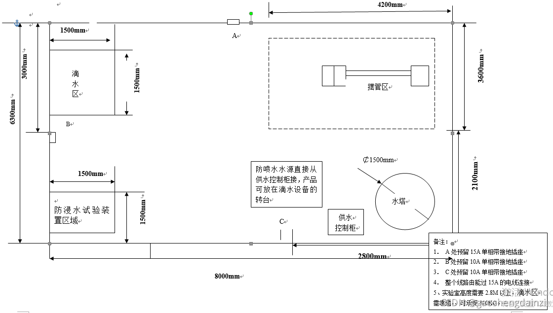 6)防水实验室面积:约60㎡;至少需要 宽4m深5m高3m以上。
