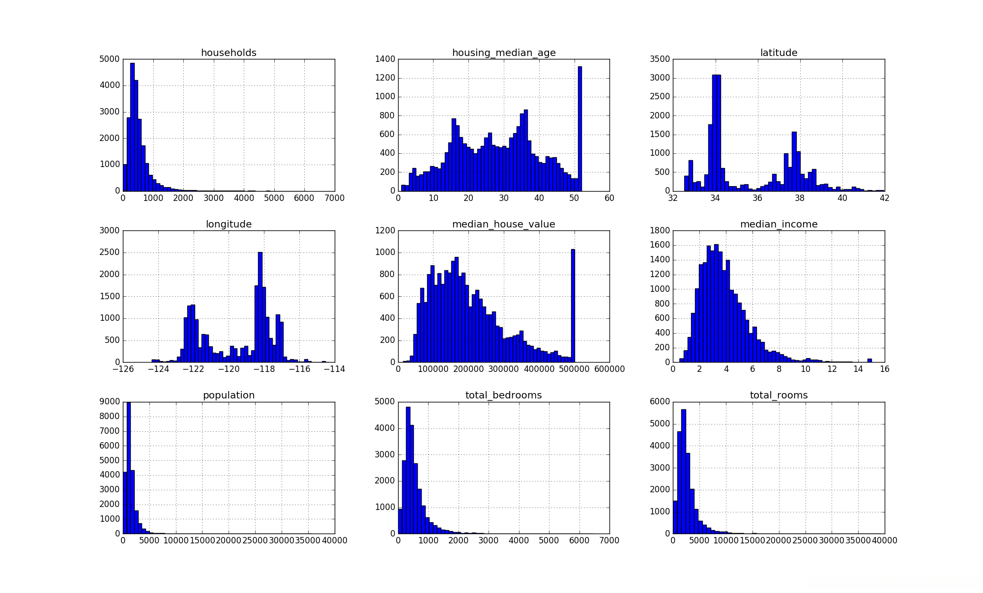 房屋年龄中位数和房屋价值中位数也被设了上限。后者可能是个严重的问题,因为它是你的目标属性(你的标签)。你的机器学习算法可能学习到价格不会超出这个界限。你需要与下游团队核实,这是否会成为问题。如果他们告诉你他们需要明确的预测值,即使超过