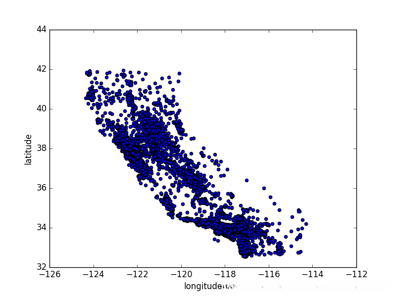 因为存在地理信息(纬度和经度),创建一个所有街区的散点图来数据可视化是一个不错的主意(图 2-11):