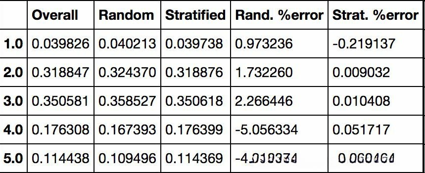 使用相似的代码,还可以测量测试集中收入分类的比例。图 2-10 对比了总数据集、分层采样的测试集、纯随机采样测试集的收入分类比例。可以看到,分层采样测试集的收入分类比例与总数据集几乎相同,而随机采样数据集偏差严重。