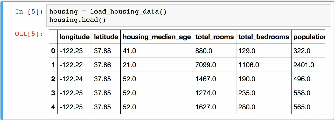 每一行都表示一个街区。共有 10 个属性(截图中可以看到 6 个):经度、维度、房屋年龄中位数、总房间数、总卧室数、人口数、家庭数、收入中位数、房屋价值中位数、离大海距离。