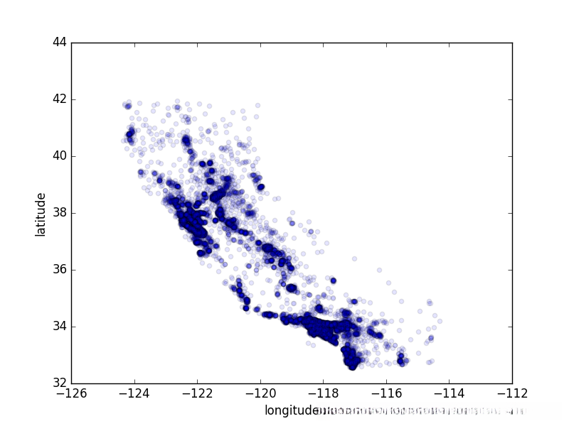 这张图看起来很像加州,但是看不出什么特别的规律。将alpha设为 0.1,可以更容易看出数据点的密度
