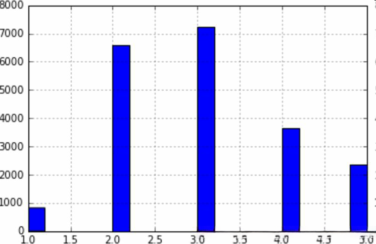 假设专家告诉你,收入中位数是预测房价中位数非常重要的属性。你可能想要保证测试集可以代表整体数据集中的多种收入分类。因为收入中位数是一个连续的数值属性,你首先需要创建一个收入类别属性。再仔细地看一下收入中位数的柱状图(图 2-9)(译注:该图是对收入中位数处理过后的图):
