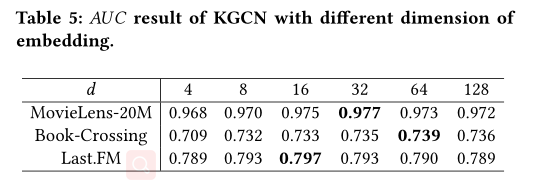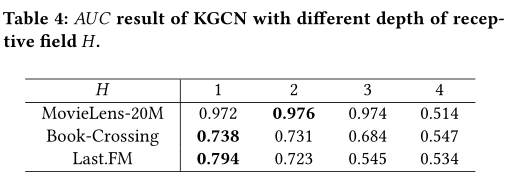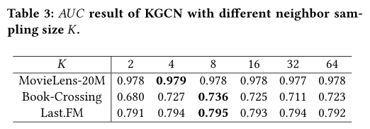 我们改变了抽样邻居K的大小,以调查KG使用的功效。从表3中我们可以看到,当K = 4或8时,KGCN可获得最佳性能。这是因为太小的K没有足够的容量来合并邻域信息,而太大的K容易被噪声所误导。