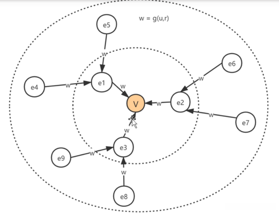 ei代表第i个邻居的特征向量,根据图采样思想,消息传递是由外而内进行的,由e4,e5传递到e1,得到e1消息聚合的特征向量后,最终再传递给中心位置V,得到特征向量