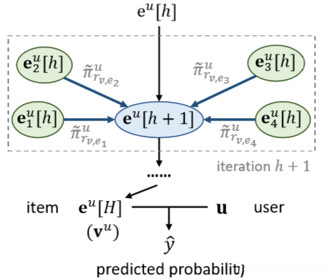 即表示目标用户u对关系Ri的偏好程度,注意这里的现实含义可以理解为计算用户对不同的关系的偏好程度,比如某个用户非常在意影片的演员,则他对于 star 这类的 relationship 会有更多的关注,也会更愿意看他喜欢的演员的电影;而对于不是很在意演员的用户,可能对导演 director 之类的 relationship 反而有更多的帮助,这里的 g 函数即用于衡量用户对于不同关系的偏好程度。也就是经过Ri边时消息传递的权重。因为每次消息传递都加入了用户向量,所以结果比直接取关系向量ri更能体现出用户U的注意力。接下来