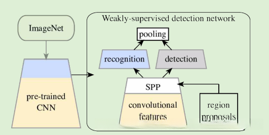 该研究旨在设计一种弱监督的深度检测架构,在优化网络结构的基础上,仅基于图像级别的标注信息实现区域选择与分类功能。