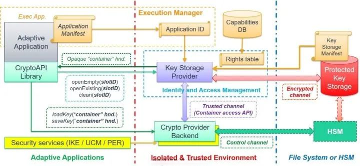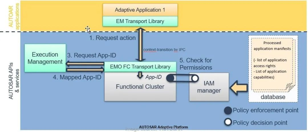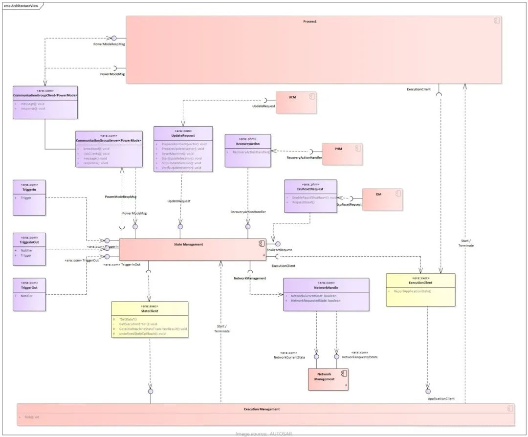 请注意,关键组件EM(电子管理系统)、SM(软件管理系统)和PHM(物理 health management)与系统安全高度关联; 安全执行管理和运行状况监视构成了自适应应用安全运行的核心支撑. EM、PHM、SM 元件间相互依存并协调运作, 以保证AUTOSAR自适应平台的功能性安全保障.