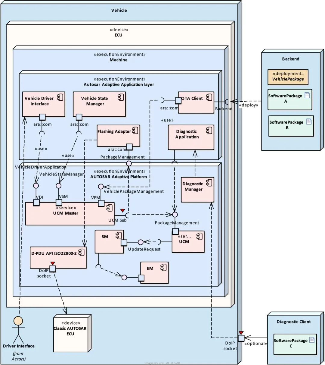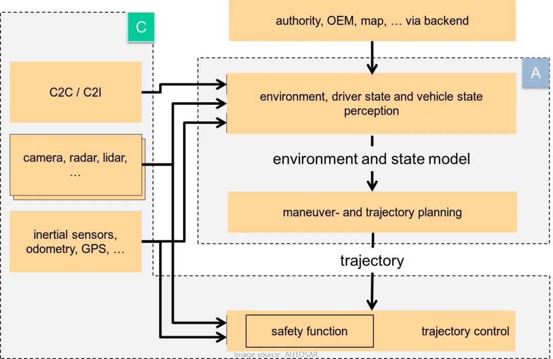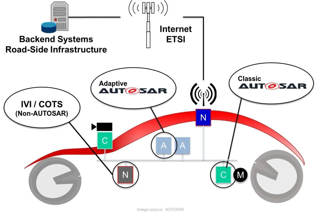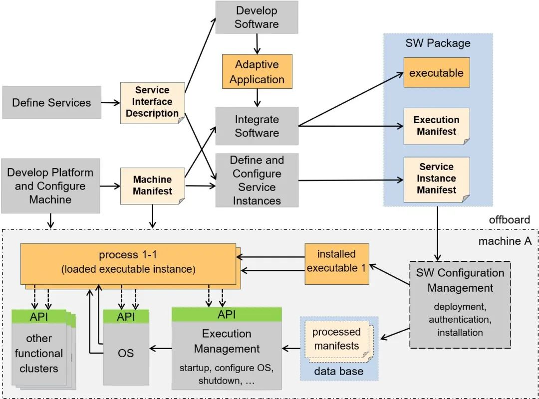 该方案通过AUTOSAR经典平台(CP)标准成功应对了深嵌式ECU的技术挑战,在现有架构难以满足这些ECU需求的情况下提出了一种创新解决方案。为此建议采用第二个软件平台——AUTOSAR自适应平台(AP)。该平台具备高性能计算与通信能力,并且提供高度灵活的配置选项例如支持在线升级的技术能力。其中一些专为CP设计的功能模块如电信号访问与汽车专用总线系统的整合已实现并被整合进AP中但并未被列入标准化优先项目这一安排既保证了系统的灵活性又避免了不必要的标准化负担。