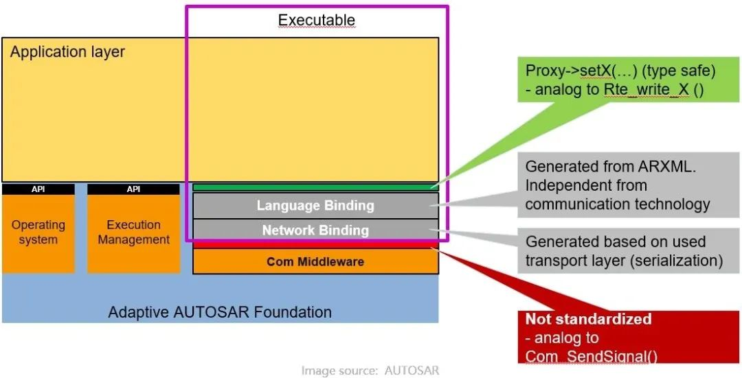 不论是基于自适应平台的基础组件还是相关的服务模块,在AA视角下都不影响其核心功能设计 - 这些接口仅限于提供一个固定的C++接口框架,并且对于AP来说,在未来可能会支持更多绑定其他语言的可能性。