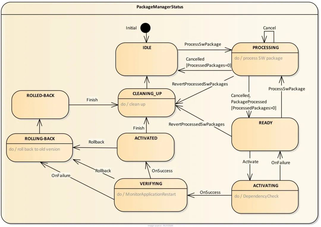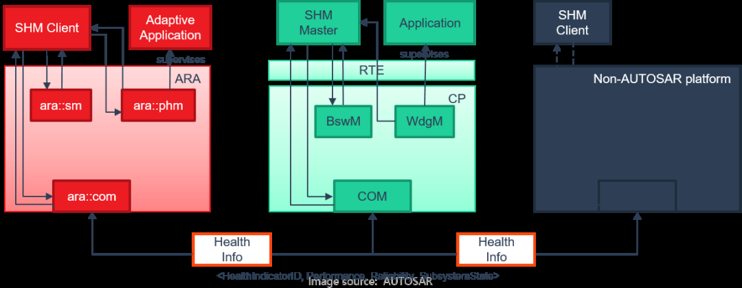 CP 和 AP 共享的功能被基础文档进行了详细说明,并被命名为'运行状况监视'(RS_HealthMonitoring [17] 和 ASWS_HealthMonitoring [18])。AP 文档专门介绍了 AP 的其他规范,并被命名为'平台运行状况管理'(RS_PlatformHealthManagement [19]、SWS_PlatformHealthManagement [20])。