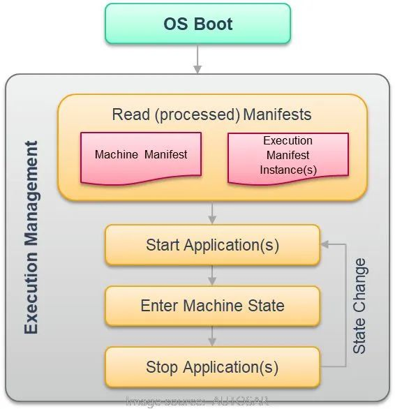 应用的生命周期基于执行管理(EM)进行管理。应用的加载/启动是依靠EM的功能进行管理的,并且在系统集成阶段或运行阶段需要适当配置才能启动应用。
