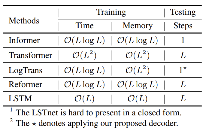 计算性能 在多元环境下及现有最优实现的基础上,在图(5)中我们展开了详细的运行时间评估。在训练环节中,在基于Transformer架构的方法中达到最高水平的训练性能的是Informer(以红线标记)。而在测试环节上,则我们的方法显著优于所有具备生成式解码能力的方法。表4详细列出了理论时间复杂度与内存消耗的相关数据对比结果,并证实了Informer算法性能与实际运行时测试结果的高度一致性。值得注意的是LogTrans算法着重于改进自注意力机制,在LogTrans架构下我们采用了本文提出的新解码器构建进行了公平性对比实验(表4中的相关数据)。
