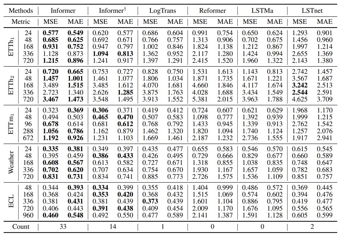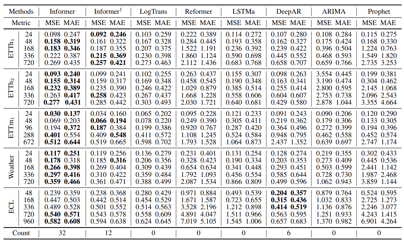 Baselines: 作者采用了五种时间序列预测方法用于对比分析,并具体包括ARIMA、Prophet、LSTMa、LSTMn和DeepAR等模型类型。通过进一步深入研究ProbSparse自我注意力机制在Informer框架中的表现情况,并结合当前研究进展,在实验中引入了规范化的变体Informer† 以及高效的Reformer变体,并结合了当前最相关的LogSparse自注意力机制进行验证研究。