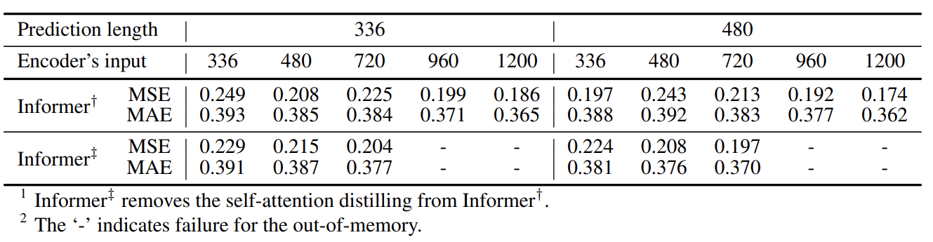 本研究中对自注意力蒸馏性能的关注点在于对比现有方法的表现差异以及优化空间的探索。作为基准模型使用的 Informer† 通过排除 ProbSparse 的自我注意力干扰来实现对传统自我注意机制的有效替代。另一个实验条件则遵循单变量时间序列的标准设置以保证结果的一致可比性。研究表明,在引入较长序列输入后, Informer† 的性能表现显著提升, 这一发现基于表 5 所示的数据并结合了多轮实验验证的结果. 此外, 探讨长序列输入在长短时记忆网络(LSTF)问题中的应用价值, 显示出该方法在预测精度方面具有明显优势. 研究表明, 自注意力蒸馏策略能够在保留原始模型核心能力的同时显著提升预测效率, 这一发现对于希望在内存受限环境下运行复杂模型的情形具有重要的指导意义.