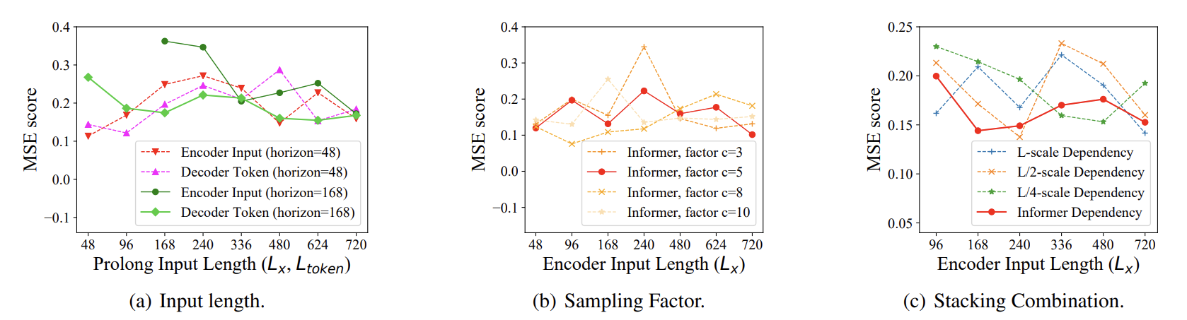 作者在单变量设置下对 ETTh1 上提出的 Informer 模型进行敏感性分析。输入长度 :见图(4a) 时,当预测短序列(如 48)时,最初增加编码器/解码器的输入长度会降低性能,但进一步增加会导致 MSE 下降,因为它会带来重复的短期模式。但是,在预测长序列(如 168)时,MSE 会随着输入时间的增加而降低。因为较长的 encoder input 可能包含更多的依赖项,而较长的 decoder token 具有丰富的本地信息。采样因子 : 采样因子ProbSparse自注意力中的信息带宽。作者从小因子 (=3) 开始到大因子,总体性能略有增加,最后在图 4b 中稳定下来。它验证了作者的查询稀疏性假设,即自注意力机制中存在冗余的点积对。作者在实践中设置样本因子 c = 5 (红线)。层堆叠的组合 :层的副本与自我注意力蒸馏相辅相成,作者在图 4c 中研究了每个堆栈 {L, L/2, L/4} 的行为。较长的堆栈对输入更敏感,部分原因是接收到更多的长期信息。作者选择的方法是红线,即连接 L 和 L/4,是最稳健的策略。
