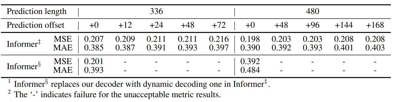 生成式解码器的性能 作者在研究中表明他们的解码器在获得"生成"结果方面的潜在价值。不同于现有方法,在标签和输出被迫对齐训练与推理时,作者提出的解码器的预测完全基于时间戳。时间戳可通过偏移量进行预测。根据表6的数据可知,在Informer‡中随着偏移量的增加其一般预测性能表现出一定的抵抗能力但在动态解码方面表现欠佳这表明该解码器能够有效捕获任意输出间的单个长距离依赖关系并避免错误的累积。