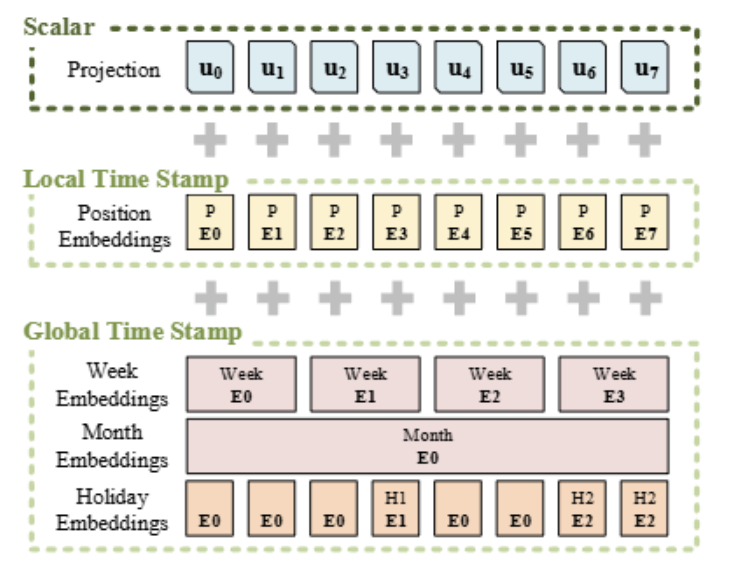 基于RNN的模型主要通过其内部循环机制来学习时序数据,并对时间戳的依赖相对较少。而在Transformer架构中,则将时间戳视为局部位置信息的一种标识。相比之下,在LSTM网络中(或LSTF模型中),为了捕捉长期依赖关系,则需要引入全局的时间信息。例如,在这种架构下可采用层次化时序编码(如每周、每月、每年)以及去知性时序编码(如假日和特定时间段)等方式。为此,本文则提出了一种统一的输入表示方法