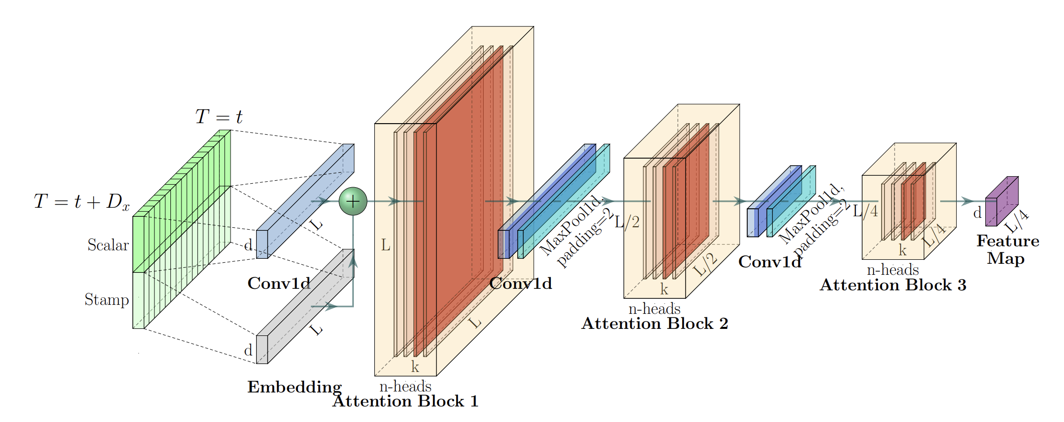 每种embedding都具有确定的vocabulary size(其最大值可达60个单位),这些单位通常基于分钟划分。此外,在统一维度方面采取措施时,作者采用了卷积核宽度为3、步长为1的一维卷积网络。
