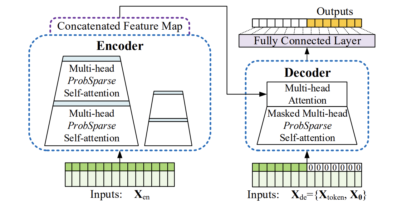 图 2:Informer 模型架构概述。左侧展示编码模块处理多长度序列输入(绿色线条表示输入序列)。研究团队采用基于概率稀疏机制的概率稀疏自注意力模块取代传统自注意力机制(蓝色方框标记)。右侧解码模块通过自注意力蒸馏技术提取主要注意力信息,并通过多层堆叠增强模型稳定性;同时,在解码过程中将目标区域置为零向量用于生成预测输出结果(橙色线条表示输出序列)。
