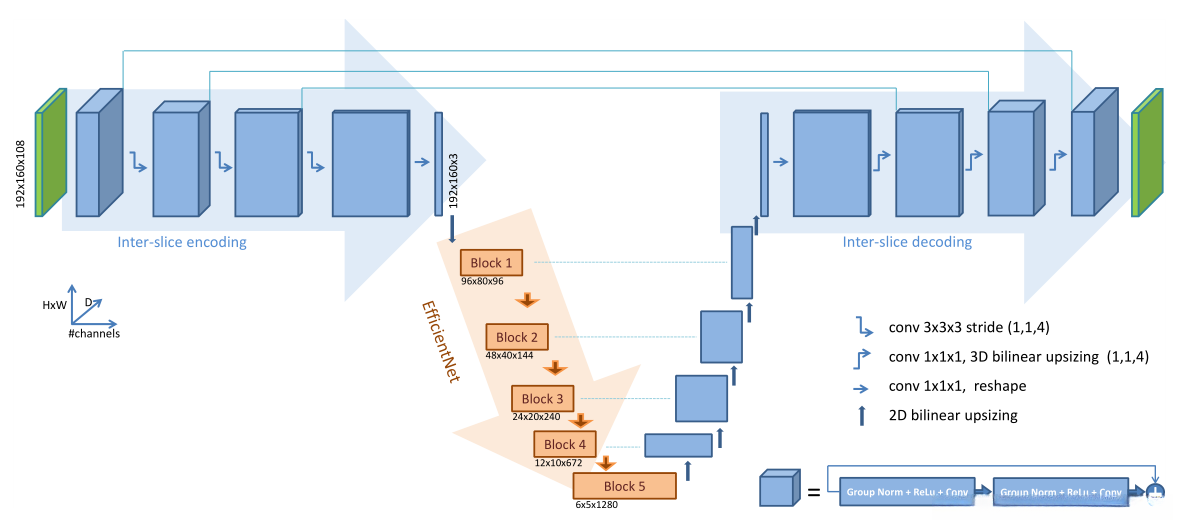 如图所示,其输入是一个一维裁剪的3D MRI图像。片间编码器和解码器都由规范的残差块构成。解码器的输出包括三个通道,并与输入通道的空间尺寸保持一致,在每个EfficientNet模块中展示了相应的输出维度。
